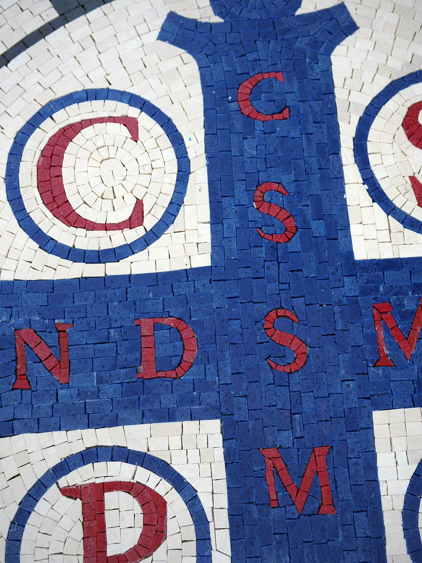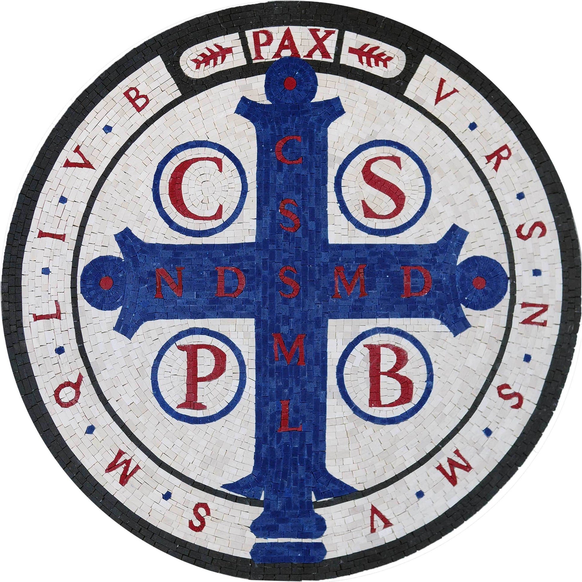 Embrace spiritual protection and historical artistry with this striking handmade natural marble mosaic featuring the powerful St. Benedict Medal design. This circular medallion is an iconic symbol known across the world for its association with blessing, peace, and protection against evil.