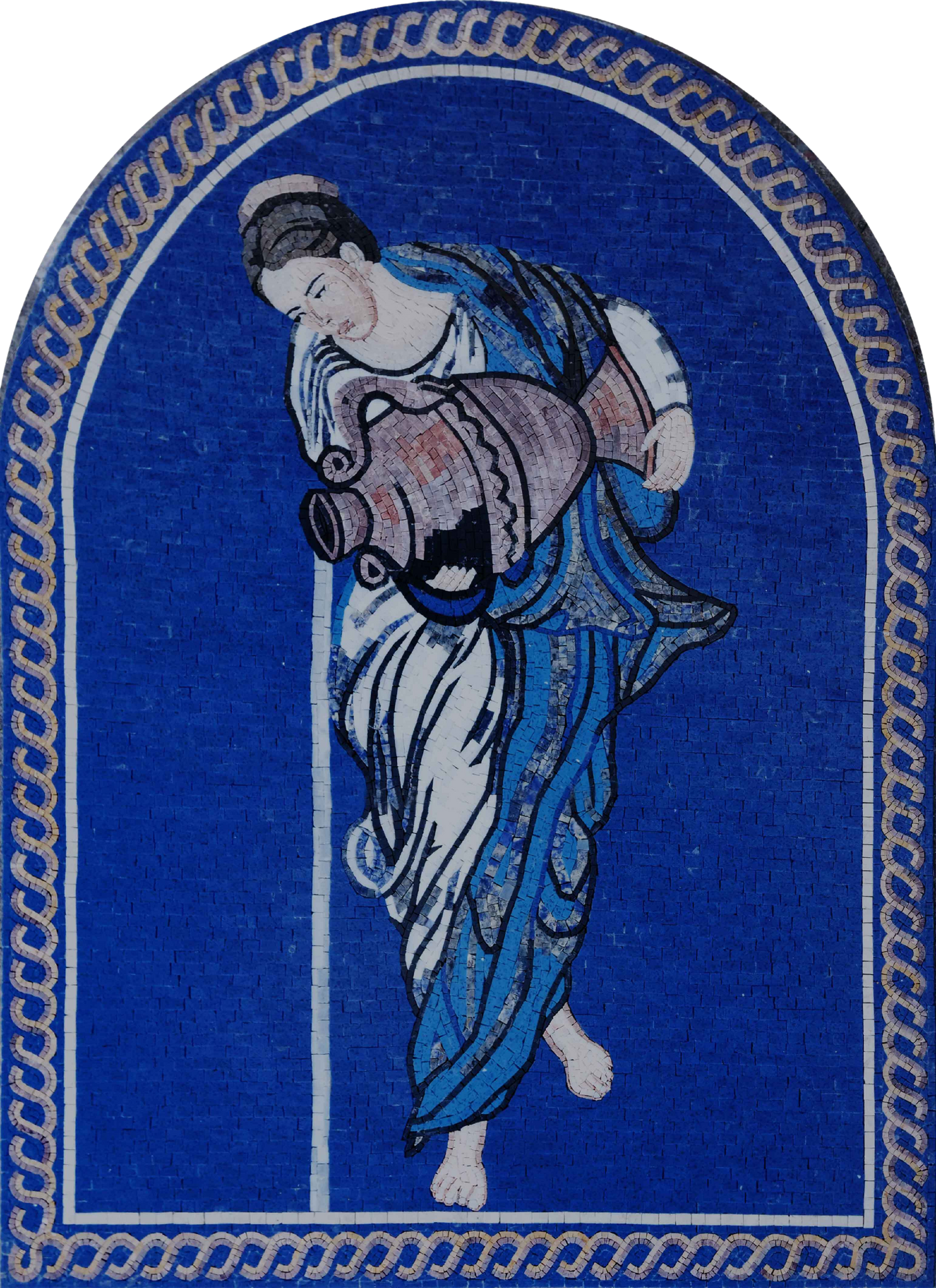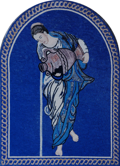 Introducing the exquisite "Greek Mosaic Art - Alectrona," a stunning representation of ancient artistry that beautifully captures the essence of mythology and culture. This piece showcases the Goddess Alectrona, known as the daughter of Helios, the sun god, and Rhodes, the goddess of the island bearing her name. Rendered in an elegant arch shape, this mosaic art piece is set against a radiant blue background that symbolizes the deep connection to the sea and sky, evoking a serene and tranquil ambiance in any space.