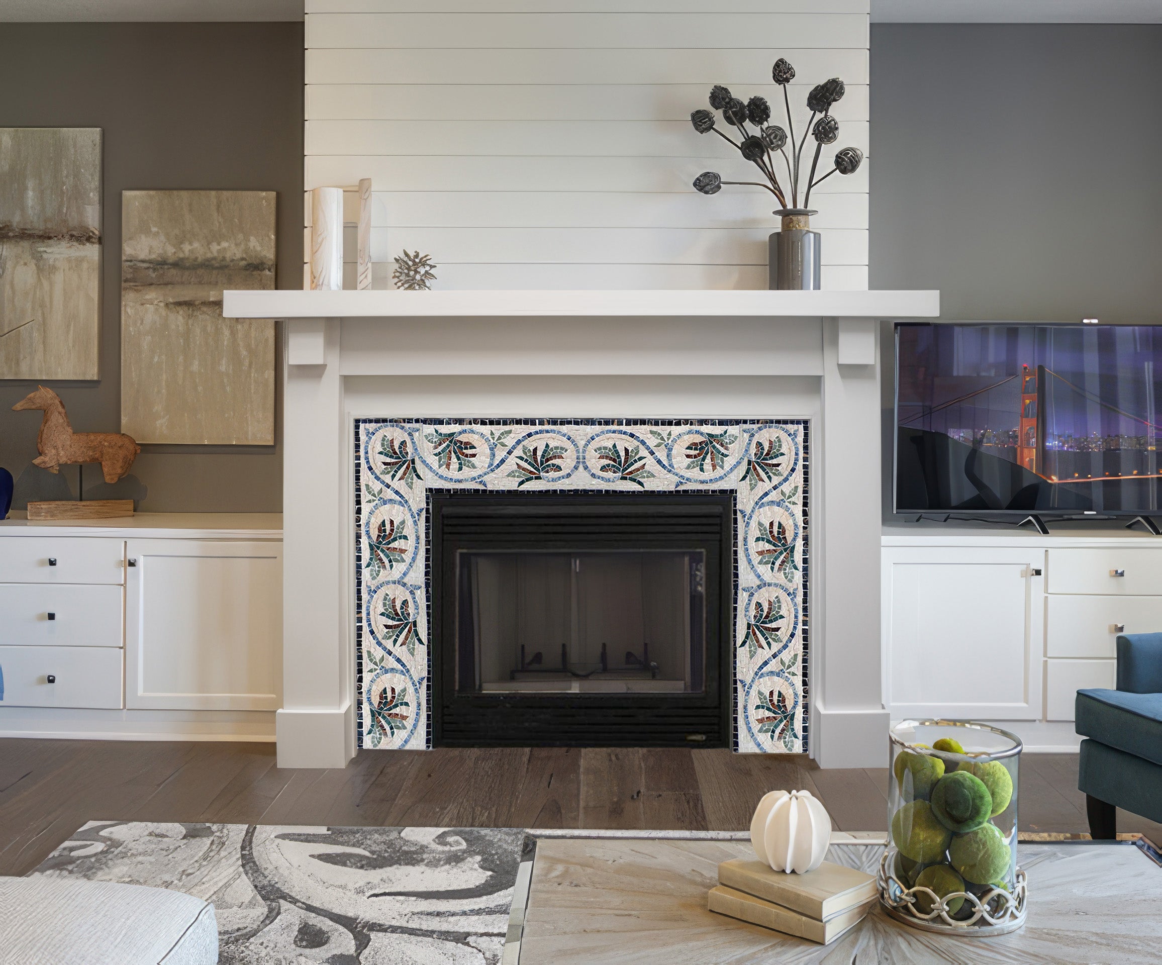 Embrace the timeless elegance of the Fireplace Border Mosaic - Intrinsic Flowers and let your fireplace tell a story. Illuminate your home with an ambiance that radiates warmth and artistry while reflecting your personal style. Redefine your hearth experience today with this one-of-a-kind mosaic fireplace design that beautifully marries charm and modernity. Don’t just light a fire; create a masterpiece.