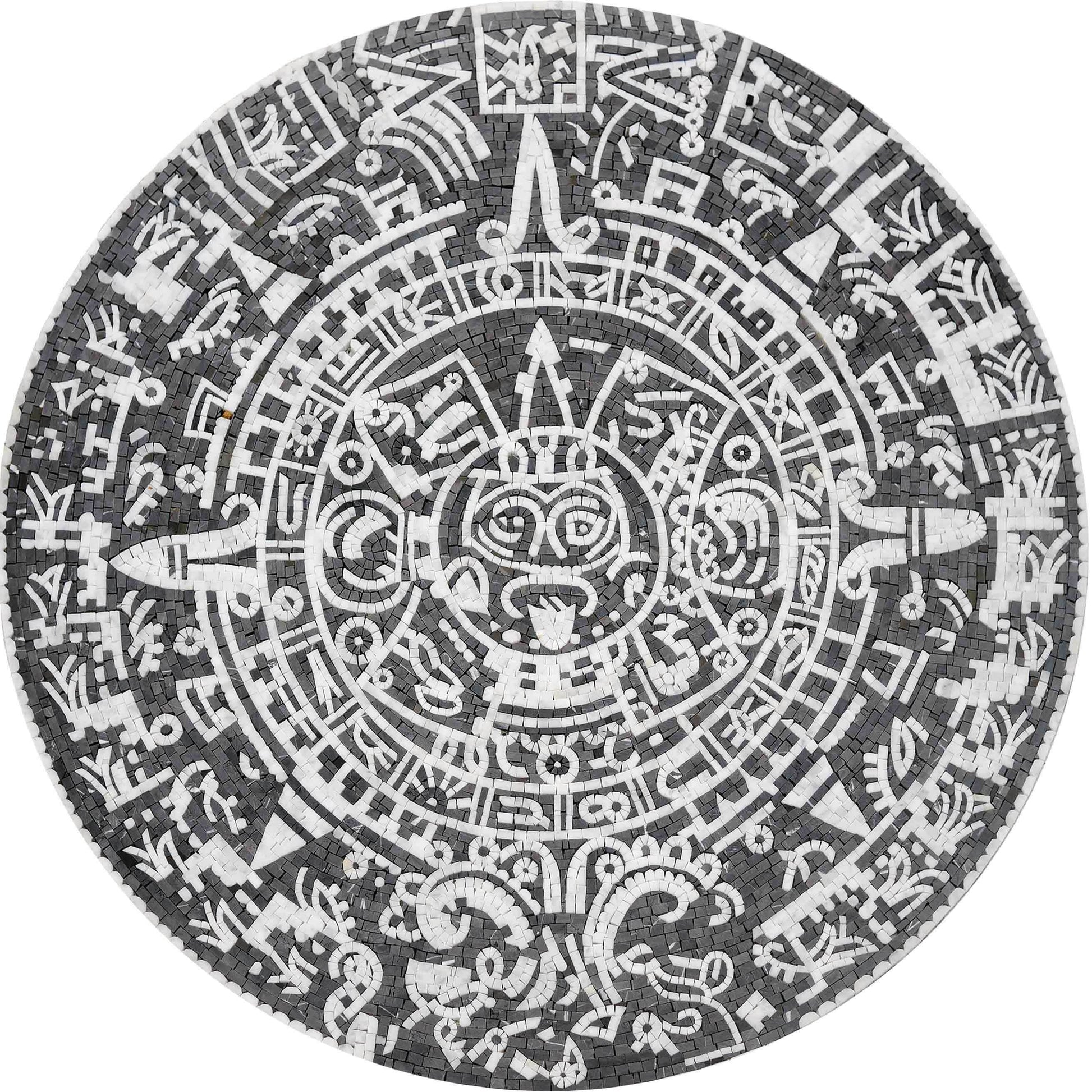 This impressive circular mosaic art panel is a detailed reproduction of the famous Aztec Calendar Stone (also known as the Sun Stone). The intricate and highly symbolic design is rendered in a powerful black and white contrast, utilizing thousands of tiny mosaic tiles to capture the complex glyphs and concentric rings of the original monolithic sculpture. The white tiles highlight the intricate iconography, including the central face of the sun god Tonatiuh, against a dark, dramatic background. Crafted from durable natural stone, this piece is an excellent choice for a cultural statement on a patio, a unique indoor floor mosaic inlay, or a commanding piece of wall art in a library, study, or living space. Its timeless design and robust construction ensure it makes a profound and lasting cultural impression.