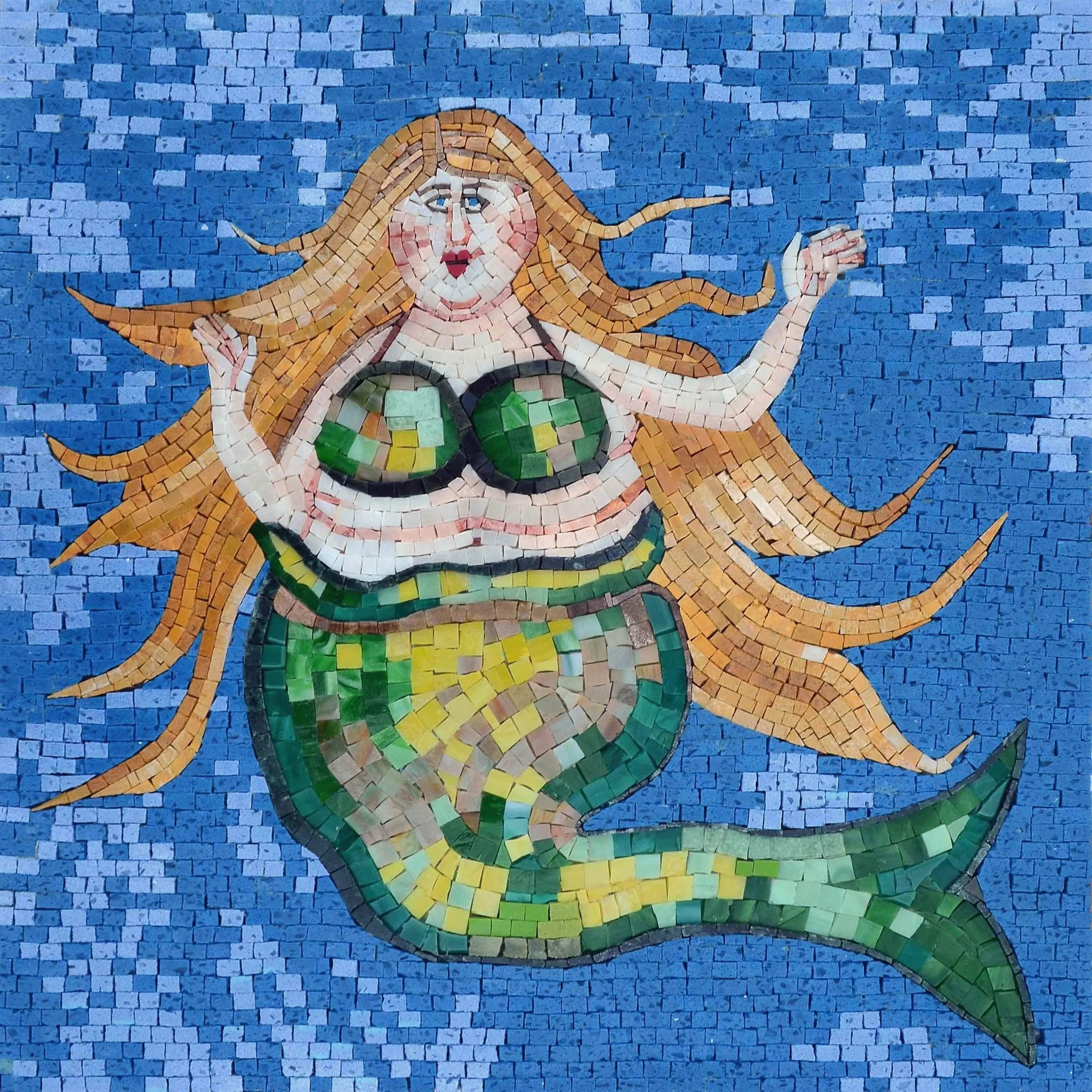 Handcrafted with meticulous attention to detail, each tile showcases vibrant shades of green, complemented by an array of colors that bring the mermaid to life. The intricate design not only adds beauty but also tells a story, inviting viewers to dive into a world of imagination and artistry. The mosaic is versatile enough to fit into various decor styles, from coastal themes and bohemian vibes to modern aesthetics.
