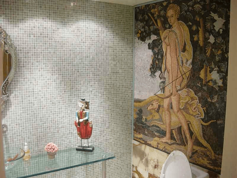 Crafted with meticulous attention to detail, this masterpiece is composed of thousands of individual natural stones, each hand-cut to create a breathtaking visual experience. The intricate design features a variety of textures and colors, harmoniously blended to depict Diana in a captivating and dynamic pose. Each tile contributes to a narrative that celebrates the goddess's connection with wild animals and the serene woodlands she embodies.