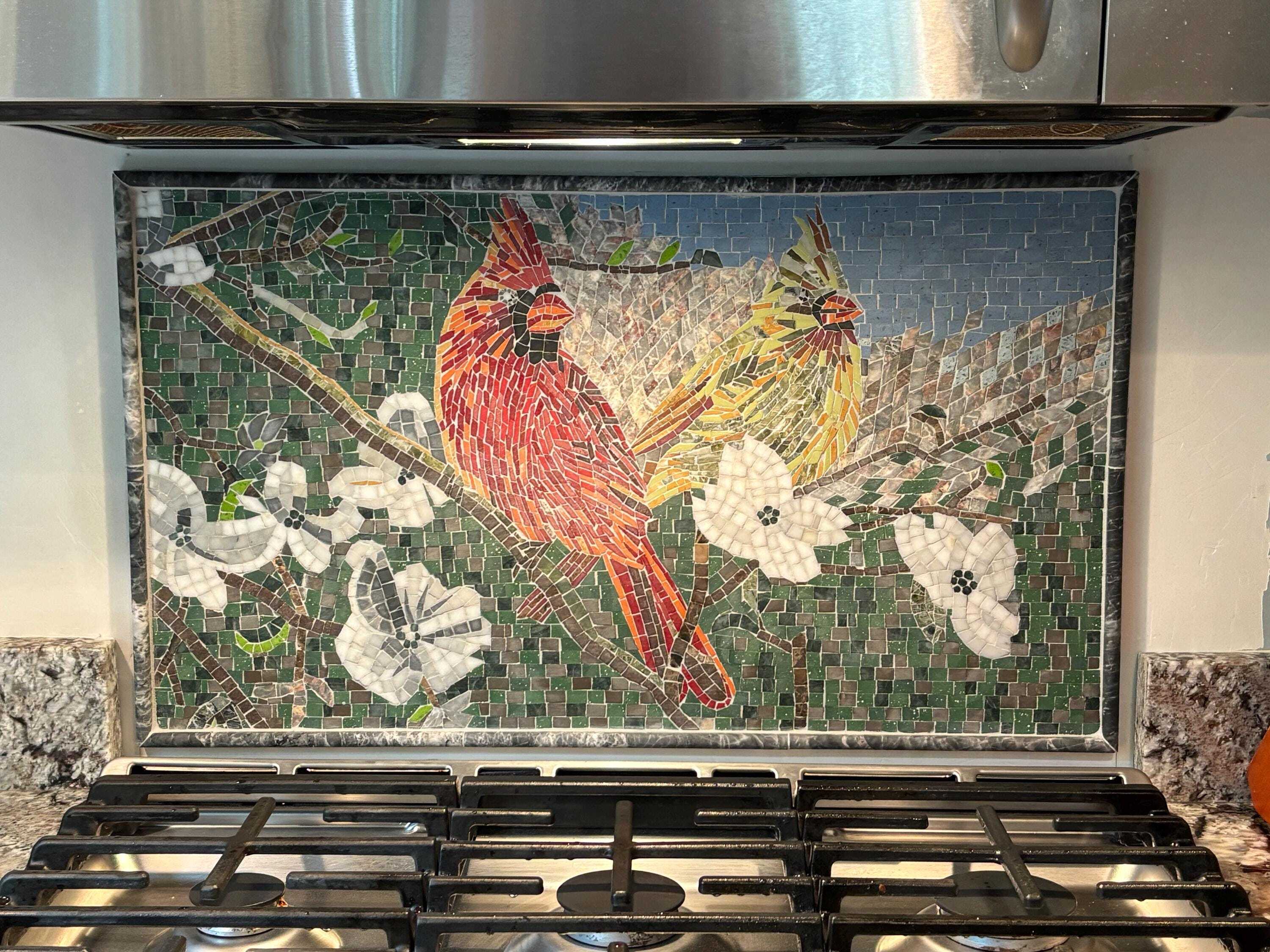 Admire this vibrant cardinal bird mosaic art, a stunning example of handcrafted tile artistry. Featuring a brilliant red male cardinal and a subtle yellow female cardinal perched on a blossoming branch, this mosaic captures the beauty of wildlife in intricate detail. Explore the texture and color variations achieved through carefully placed mosaic tiles, perfect for bird lovers and mosaic art collectors. Discover more handcrafted bird mosaics and unique tile art in our collection.