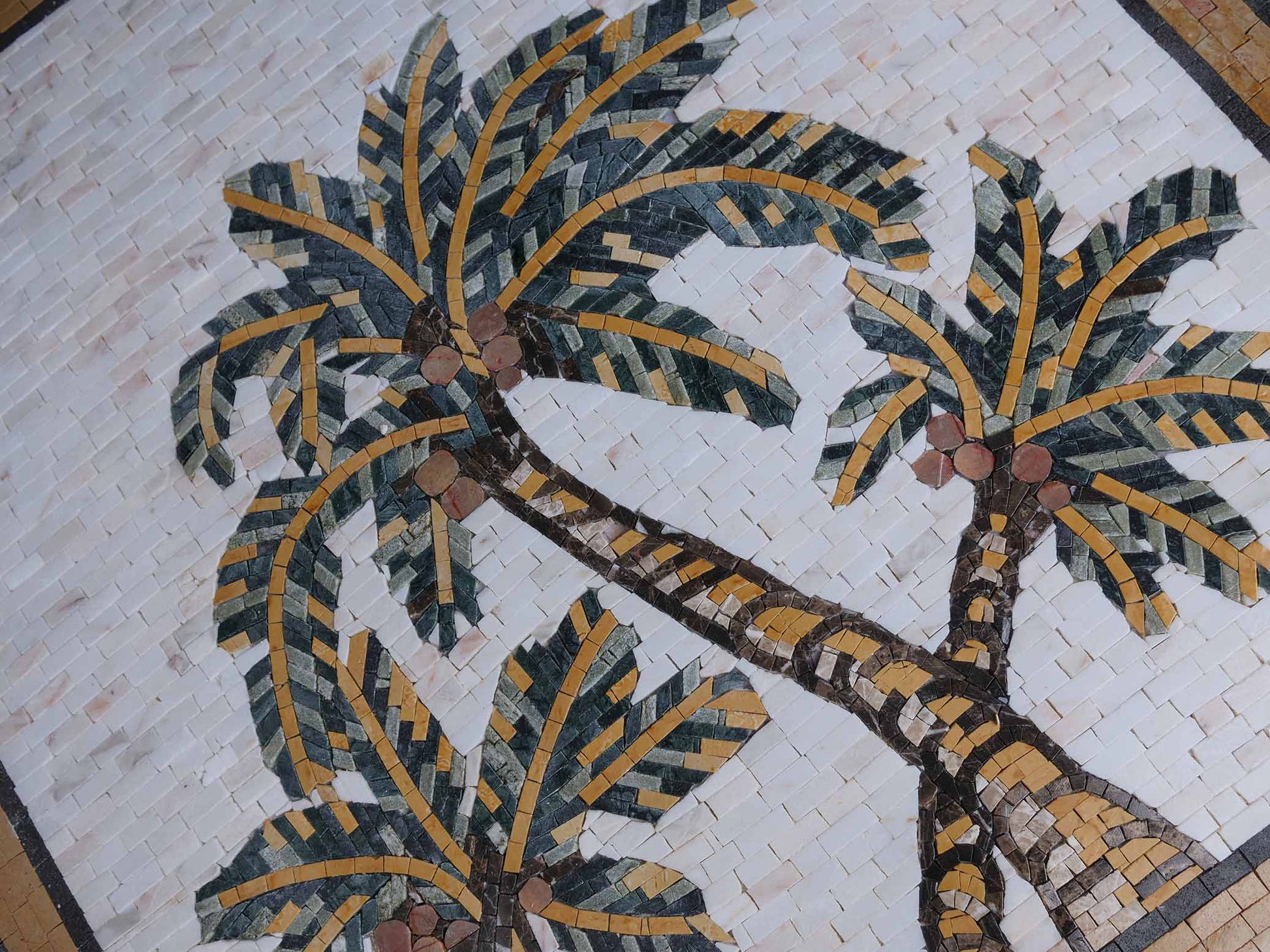 Versatile in its application, "The Palms" is designed to enhance any space. Whether you choose to display it as a striking wall feature or lay it down as an exquisite floor piece, this mosaic artwork elevates your interior decor and creates a sense of harmony and sophistication. Its durable construction means it will stand the test of time, remaining a cherished focal point in your home for years to come.