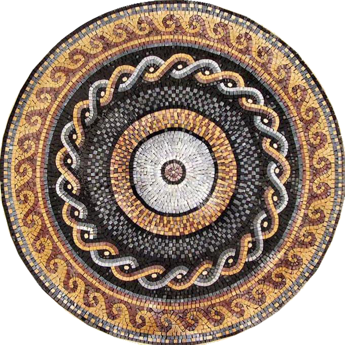 Look to the Horatio roman mosaic art medallion to infuse your home with timeless allure. A lively design that includes waves a stunning roman guilloche braid and checkerboards in red gold black gray and white this mosaic becomes a stunning centerpiece to an entryway or kitchen floor. The round shape makes it an ideal topper for a garden or patio table.