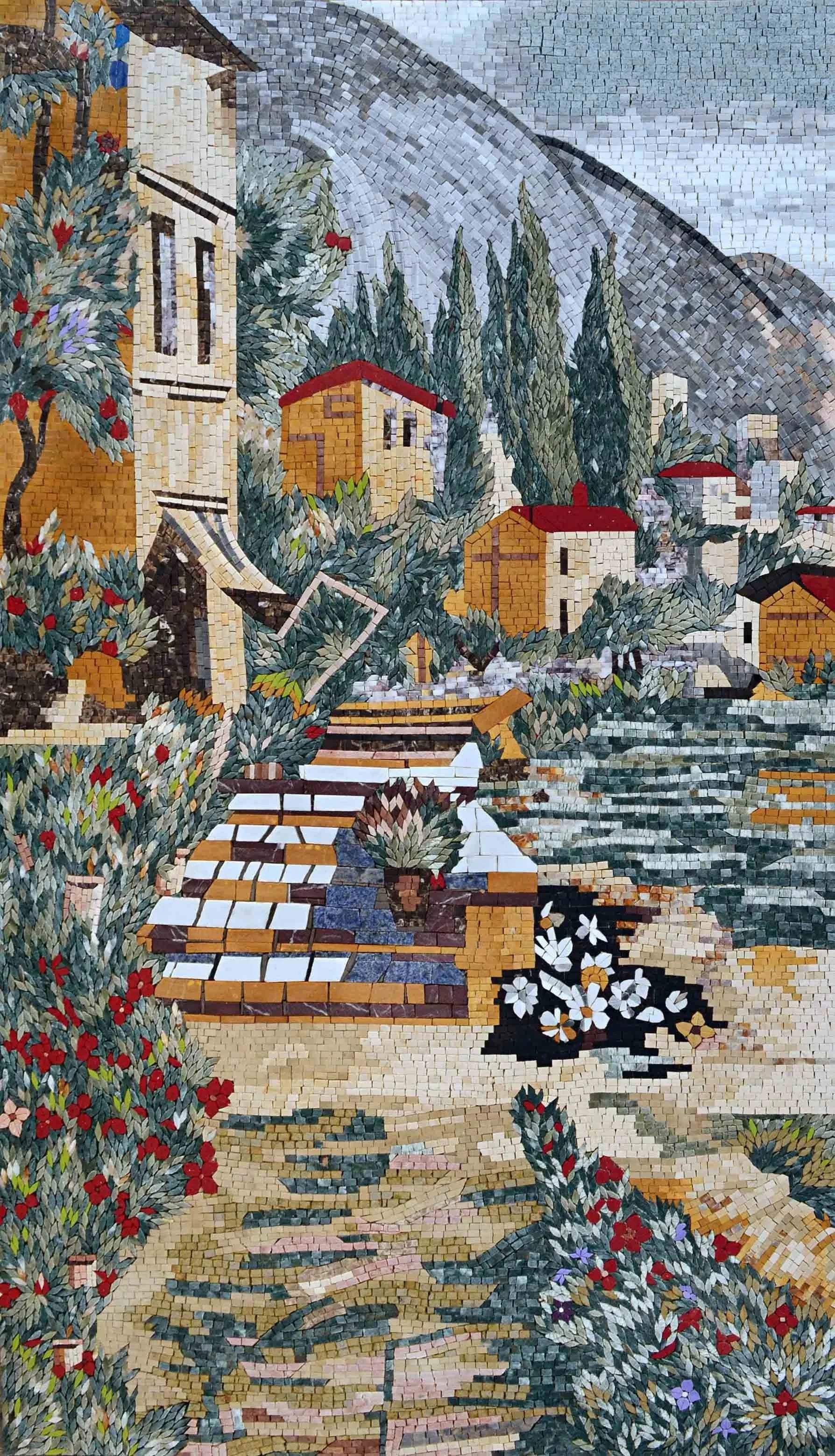 With its striking multi-colored roof, this rectangular mosaic radiates a blend of vibrant hues that evoke the essence of a picturesque meadow. The carefully crafted details reflect the tranquility of the countryside, inviting you to take a moment of respite and appreciate the natural beauty that surrounds us. It serves not only as a decorative piece but also as a conversation starter, drawing guests into the serene landscape it portrays.